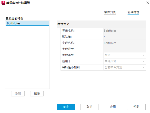 为当前选定零件或选定的一组零件添加新特性并设置特性定义。