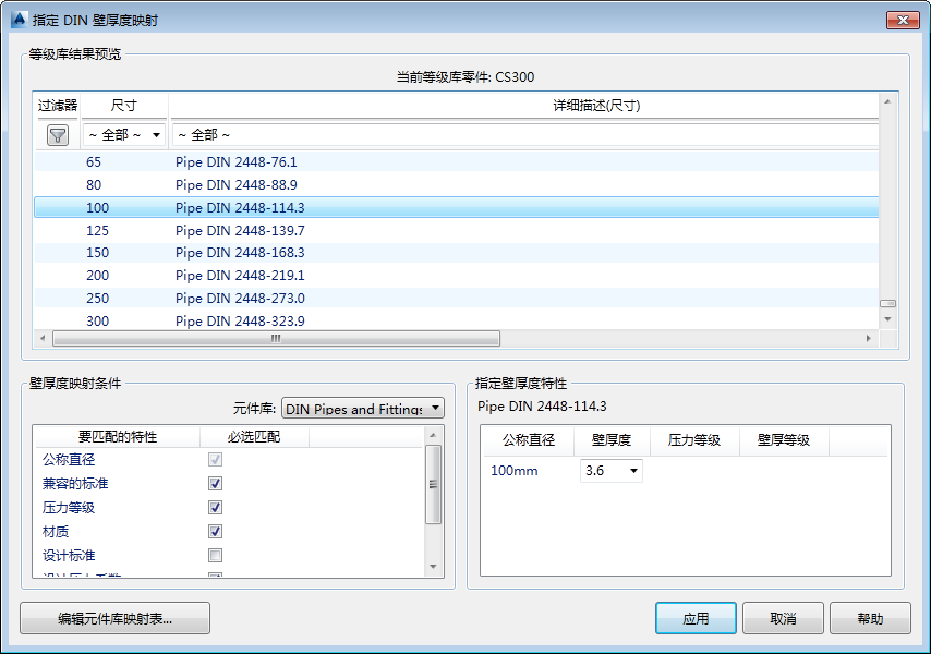 显示“编辑 DIN 壁厚度映射表”对话框。壁厚度映射将与元件库一起保存。