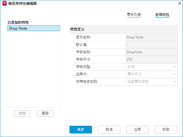 为当前选定零件或等级库中的所有零件添加新特性并设置特性定义。
