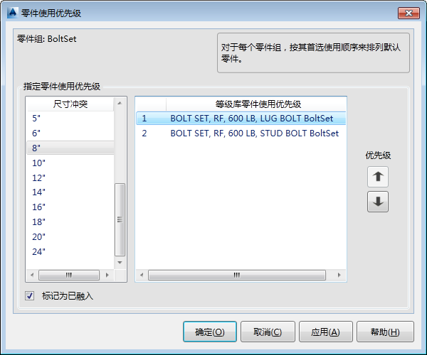 修改零件使用优先级。必须指定等级库零件,才可更改优先级。
