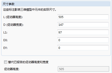 在“尺寸参数”部分中,如果更改“促动器高度”或“促动器宽度”,下面部分中对应的值也会随之更改。