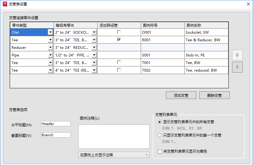 定义在支管表中使用的管件,也可以设置支管表的显示选项。