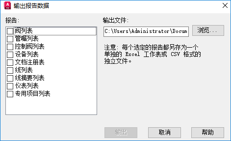 注: 只有在选择一种或多种报告类型并指定了输出文件时,“输出”按钮才会变为活动状态。