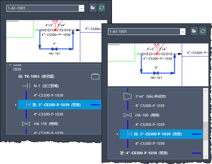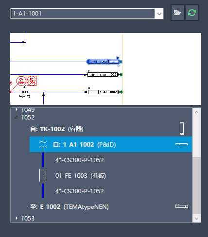 对于通过跨多个 P&ID 图形的页间连接符连接的线组,其他 P&ID 图形的起点/终点元件将显示在树状图中。