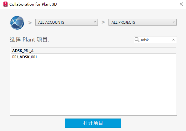 系统将显示您有权访问的 Plant 协作项目列表。左侧的下拉列表(在 Plant 项目上方)显示您有权访问的 Autodesk Docs 帐户。右侧的下拉列表显示您有权访问的该帐户内的 Autodesk Docs 项目文件夹。