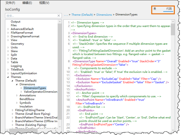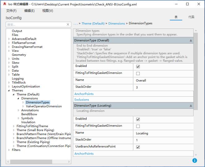 Iso 样式编辑器显示用于高级等轴测自定义的相应 IsoConfig.xml。在“项目设置”对话框的“ISO 设置”页面上,单击 。