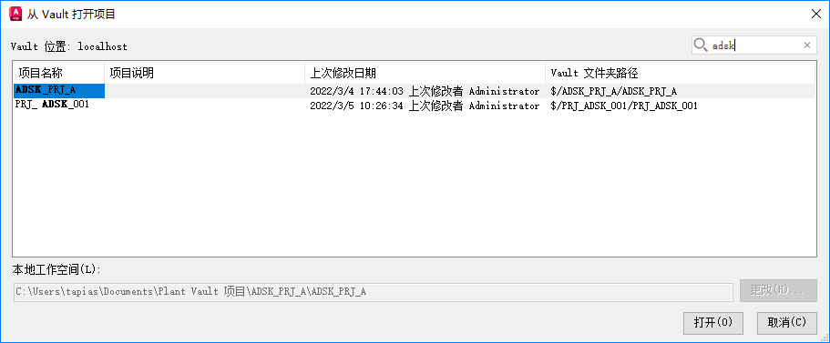 在“从 Vault 打开项目”对话框中,从下拉列表中选择现有的 Vault 项目。