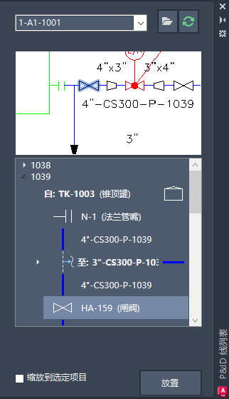 可以从“P&ID 线列表”中选择阀、管件和嵌入式仪表,并在模型中放置映射的 Plant 3D 对应对象。