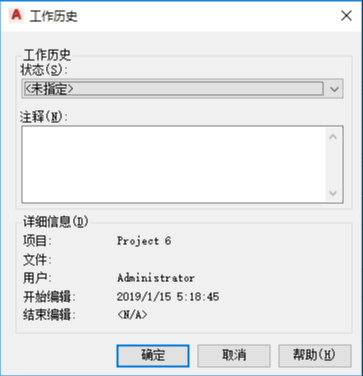 如果项目管理员已配置了要在您打开或关闭图形时显示的“工作历史”对话框,则您也可以在此对话框中输入状态和注释。注意,它不是用于存储、检索或控制图形版本的机制。