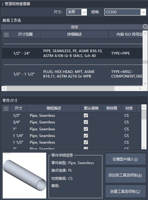 显示 AutoCAD Plant 3D toolset 中的当前等级库,并使您可打开并查看等级库工作表,将等级库工作表中的零件插入到模型中,以及修改工具选项板。