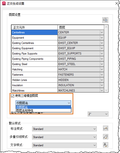 与手动指定图层相比,您可以选择“使用三维模型图层”选项以允许正交对象直接从原始三维模型继承图层。您还可以选择是仅显示图层名称还是提供图层名称及其关联特性。