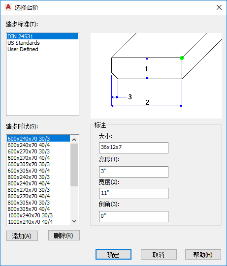 设置台阶的几何图形设置。括号内指明的数值与预览图像中位号的几何图形相对应。
