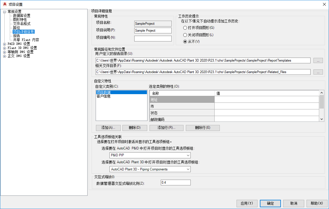 列出所有 AutoCAD 工具选项板组,从中选择在 AutoCAD P&ID 中打开项目时显示的组。