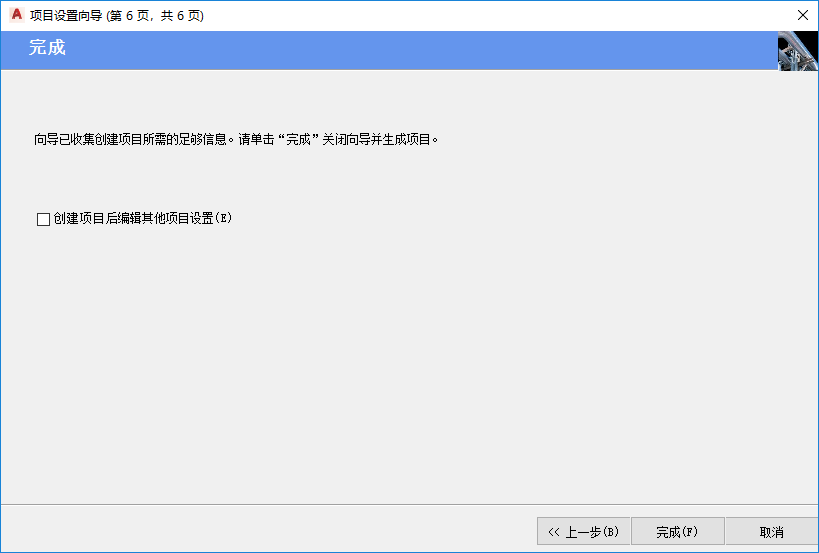 - 在项目设置向导(第 6 页,共 6 页)中,如果要更改默认项目设置,请选中标有“创建项目后编辑项目特性”的复选框。单击“完成”。