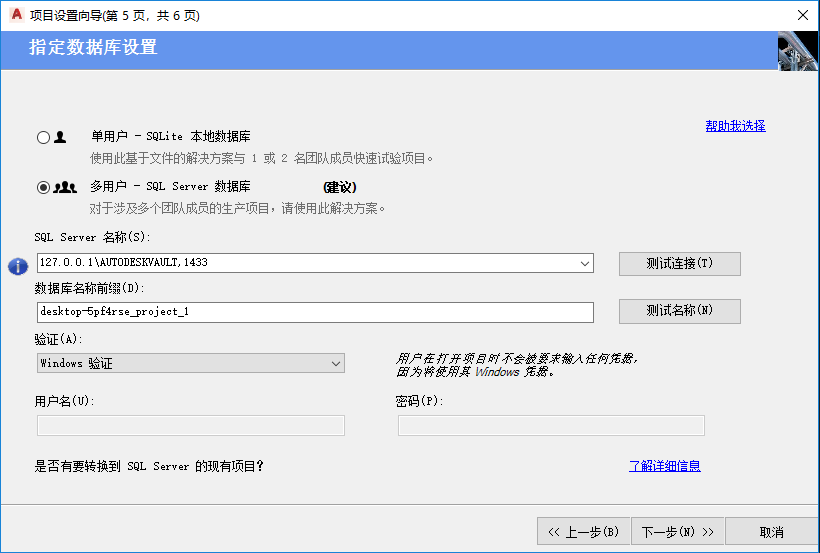 4. 在“指定数据库设置”页面中,指定服务器和 Plant 项目数据库前缀。