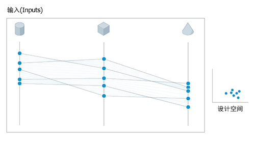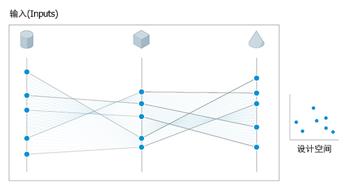 衍生式设计会根据分析类型定义的约束条件,使用指定变量在其定义范围内的随机值来生成结果。结果是一系列可能的解决方案,表示变量值的随机采样。