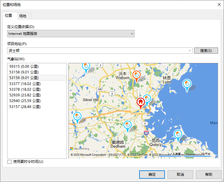可用气象站将显示在地图和左侧的列表中。通常,您应该选择一个离您最近的气象站。但是,您可能希望附近所选的气象站在海拔、土地和水源功能上能够更好地反映模型所在地的实际情况。