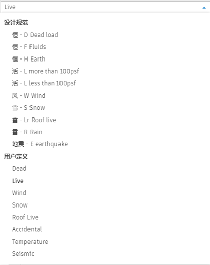 注: 对于美国用户来说,“名称”和“性质”参数存在冗余。但是,对于其他地理区域的用户来说通常很有用,这些区域需要更详细的荷载分类(类别)以及子类型(性质)。每个子类型都可以应用不同的组合系数。