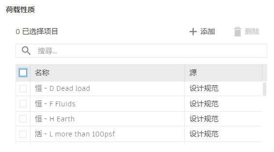 注: 您可以编辑或删除手动添加的荷载性质。无法编辑或删除选定设计规范提供的荷载性质。这些内容仅通过选择其他设计规范进行更新。