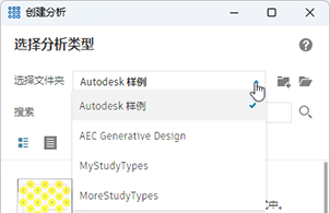 要使用 Autodesk 示例之一创建分析,请在“创建分析”对话框中,为“选择文件夹”选择“Autodesk 样例”。
