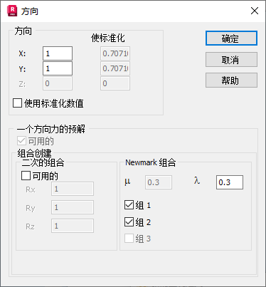 继续在“地震分析”对话框中操作,单击“方向和组合”。对于此项目,将“Newmark 组合”设置为“组 1”和“组 2”(如下所示),然后单击“确定”。