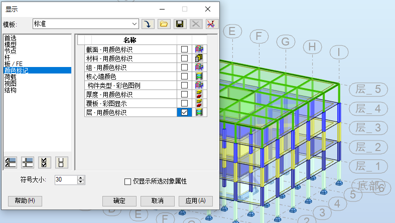 在“显示”对话框中,选择“用颜色标记”、选择“楼层 - 用颜色标记”,然后单击“确定”。每个楼层都会显示不同颜色,如下所示。