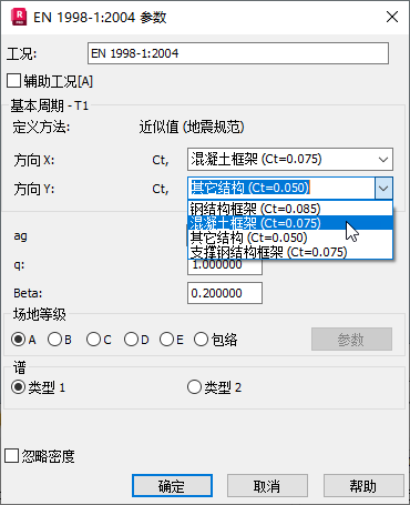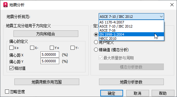 在“地震分析”对话框中,展开左上角的规范列表,如下所示。选择“EN 1998-1:2004”。