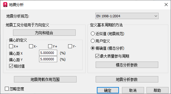 在“地震分析”对话框的“定义基本周期值的方法”区域中,选择“精确(模态分析)”,如下所示。