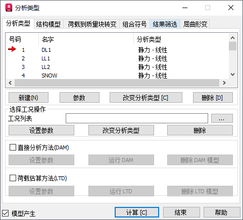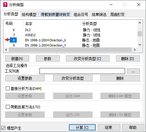 在“新的工况定义”对话框中,选择“地震(等效侧力法)”,然后单击“确定”。