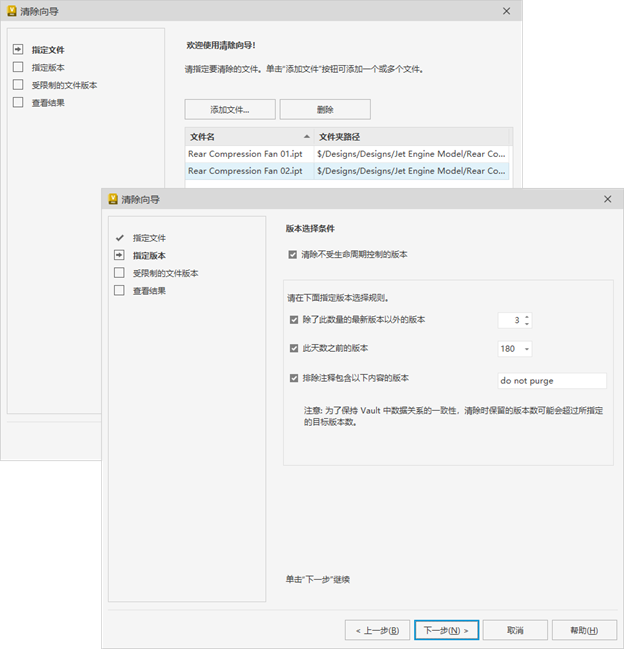 系统会提示您设置要保留的文件数量(注意,永远不能清除最新文件)、文件应保留的时间,或根据注释设置要保留的文件。将这些设置结合起来,就会得到一个符合清除条件的文件版本列表。