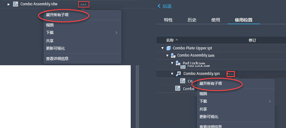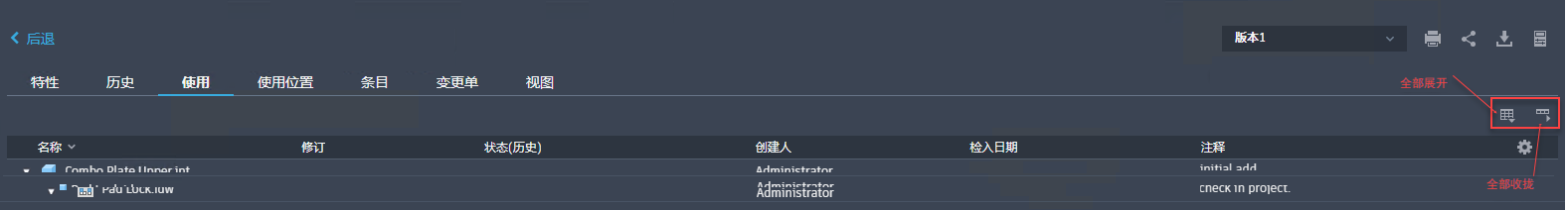在“文件”(“使用”和“使用位置”选项卡)和“条目”(“使用位置”和“BOM 表”)详细信息页面上展开或收拢树视图中的行。