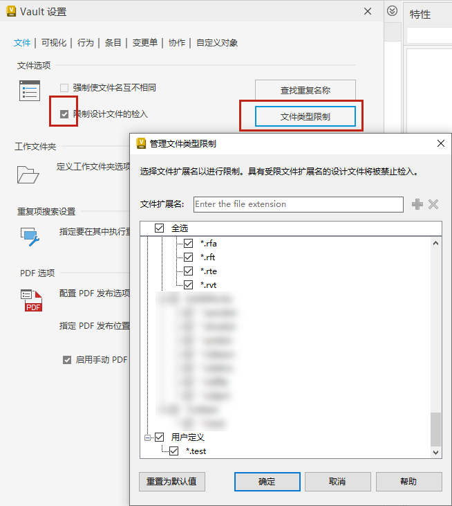 管理员可以定义在“限制设计文件的检入”处于启用状态时不检入的设计文件的列表。可以将文件扩展名添加到用户定义的列表中,但不能删除系统默认扩展名。