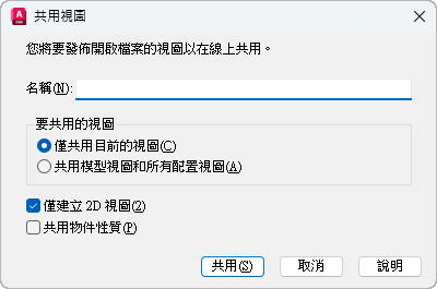 命名共用視圖。該名稱最多可包括 255 個字元,並可包括字母、數字、空格以及任何未被作業系統或此程式用於其他用途的特殊字元。