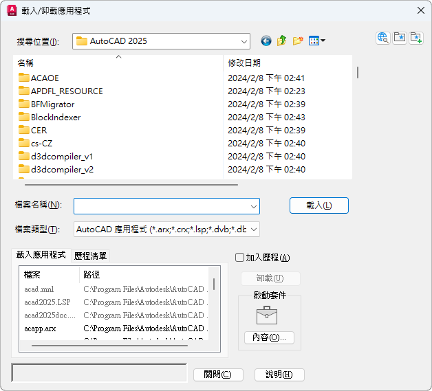 載入或重新載入目前在檔案清單或「歷程清單」頁籤內所選定的應用程式。在您尚未選取可載入的檔案之前,無法使用「載入」。會立即載入 ObjectARX、VBA 和 DBX 等應用程式,但 LSP、VLX 和 FAS 等應用程式則會列入佇列,等到您關閉「載入/卸載應用程式」對話方塊時才載入。