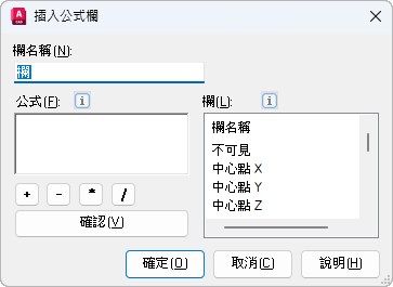顯示萃取的圖面資料和外部資料之欄名稱 (如果已經建立資料連結)。可以按兩下欄名稱將其加入公式欄位,或將其從「欄」清單拖曳到「公式」欄位。既有公式欄未列示且不能用作建立其他公式欄的值。