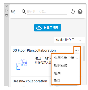 「共用視圖」選項板提供方式來顯示圖面的共用視圖,以及透過 Autodesk 網頁版和行動版帳戶張貼和回覆給同事和客戶的註解。