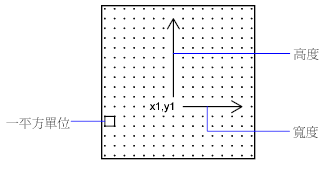 下圖是 16 X 16 點矩陣圖的範例,您可以使用該圖設計延伸的大字體,如日文漢字字元。在本範例中,點間距為一個單位。圖說指向一平方單位。