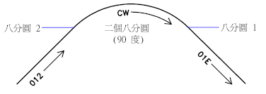 因為該弧跨越一個或多個 45 度的八分圓,即起點與終點均在八分圓邊界上,所以稱為八分弧。八分圓是從三點鐘的位置開始,以逆時鐘方向進行編號,如下圖所示。 ![]() 弧的規格為 10,radius,(-)0SC 半徑可以是介於 1 到 255 之間的任意值。第二個規格位元組分別表示弧方向 (正值表示逆時鐘方向,負值表示順時鐘方向)、其起始八分圓 ( s ,一個介於 0 到 7 之間的值) 以及其跨越的八分圓數目 ( c ,一個介於 0 到 7 之間的值,其中 0 等於八個八分圓,即一個完整的圓)。您可以使用括號來提昇可讀性。例如,您可以考慮下列造型定義片段: ...012,10,(1,-032),01E,... 該碼先繪製一個長為一個單位、方向為右上的向量,然後順時鐘方向繪製一個從八分圓的 3 號位置開始的弧 (半徑為一個單位的兩個八分圓),最後再繪製一個長為一個單位、方向為右下的向量,如下圖所示。 ![]() |