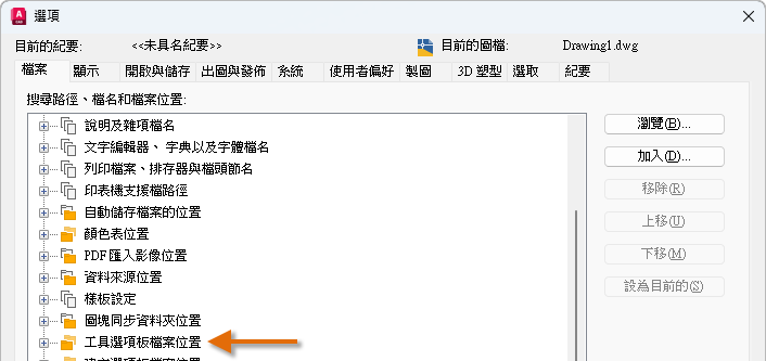 工具選項板檔案包含標準和使用者定義的工具。檔案會儲存在「工具選項板檔案位置」設定所指定的位置。