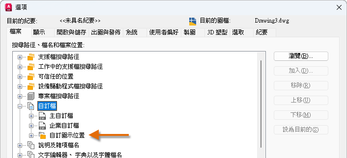 使用者紀要亦包括程式用來搜尋支援、驅動程式、自訂項目及其他檔案的位置。如果您的自訂檔案放置在預設以外的位置,這些位置的路徑會移轉,但自訂檔本身並不會移轉。使用「移轉自訂設定」公用程式的「選項」移轉您的自訂檔案,或手動複製舊版本程式和目前版本位置之間的檔案。