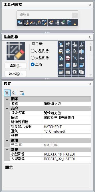 「動態顯示」窗格顯示在「自訂位置」窗格選取的使用者介面元素預覽。它可讓您編輯在「指令清單」窗格中選取的指令影像,以及在「自訂位置」或「指令清單」窗格中選取之項目所特定的性質。