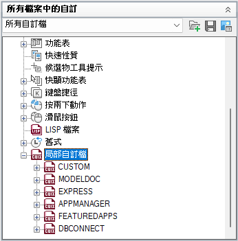 樹狀檢視用於建立並管理使用者介面元素。在建立使用者介面元素之後,您就可以將指令從「指令清單」窗格拖曳至元素中,以加入該指令。您也可以在樹狀檢視中向上和向下拖曳指令,以變更其在功能區面板或工具列等使用者介面元素的顯示順序。
