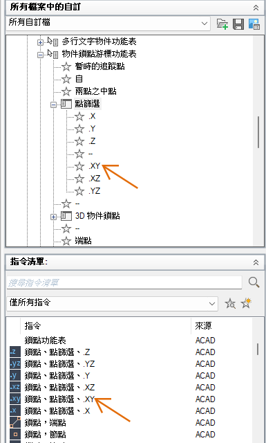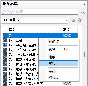 - 在「自訂」頁籤的「指令清單」窗格中,尋找您要複製的指令。