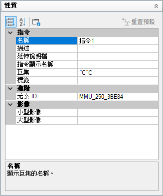 - 在「名稱」方塊中,輸入指令的名稱。加入至使用者介面元素後,該值會做為預設名稱,以及提示的一部分。