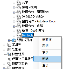 - 將新功能區面板從右側「<檔名> 中的自訂」窗格拖曳至左側「<檔名> 中的自訂」窗格中已載入 CUIx 檔的「面板」節點。