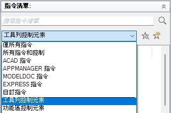 - 在「指令清單」窗格的「品類」清單中,選取「功能區控制元素」。