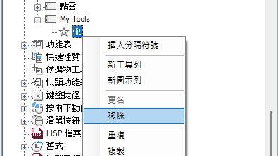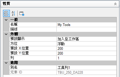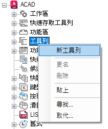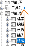 新工具列 (被命名為「工具列1」) 會置於「工具列」樹的底部。