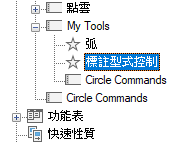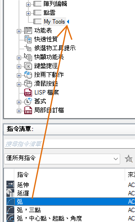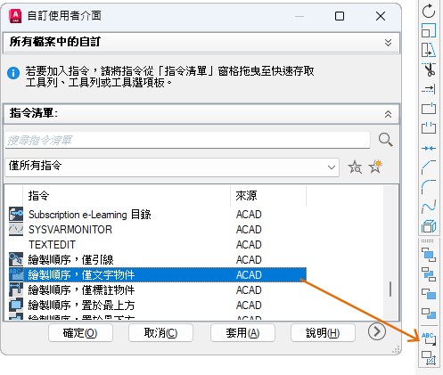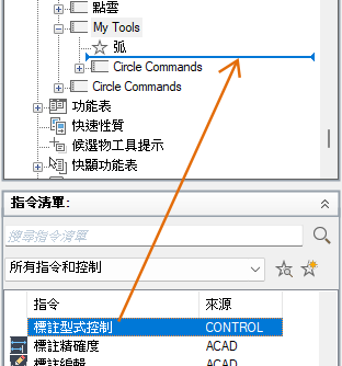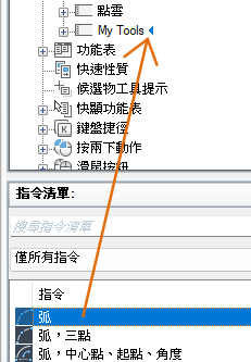 「指令清單」窗格僅會顯示工具列控制元素的清單。