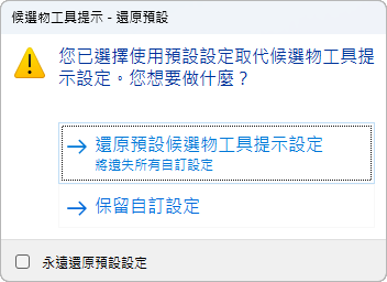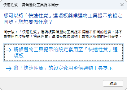 如果已勾選某個物件類型,則將游標置於相同類型的物件上時,會在候選物工具提示上顯示該物件類型的性質。清除物件類型旁邊的勾選標記可從候選物工具提示移除該物件類型的支援。