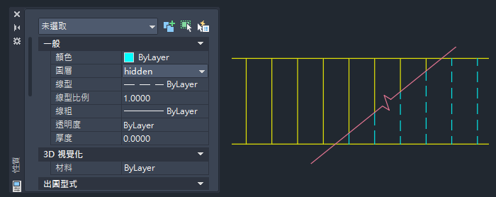 - 使用框選窗,選取切斷線右側的六條線,並將圖層變更為 hidden。